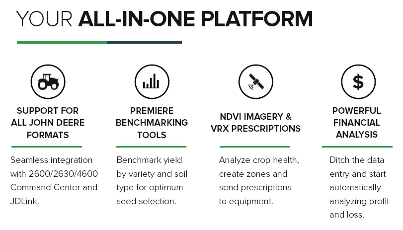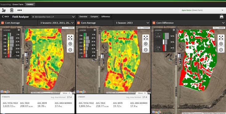 Collaborate to maximize profit. Direct a plan with precision. John Deere Operations Center is a set of online tools that enable access to farm information anytime, anywhere. Tools in the Operations Center provide growers and their partners with the ability to analyze, edit, and make collaborative decisions from the same set of information to optimize logistics and plans and direct in-field work, increasing yield and profitability. Growers need to evaluate agronomic data easily and with a few button clicks. In the Operations Center, there is an approach to organizing agronomic data so that users can access the right information quickly in the Field Analyzer. By clicking on any field in the map or the Fields Panel, users will see a field icon which launches the Field Analyzer. In the Field Analyzer, users can determine which operations and layers they wish to view and evaluate, all with only a few button clicks. In the Field Analyzer, users can evaluate how decisions throughout the growing season have influenced yield. Users have the option of evaluating operational layers individually in overview mode or two at a time side-by-side in compare mode for insights from the information captured.