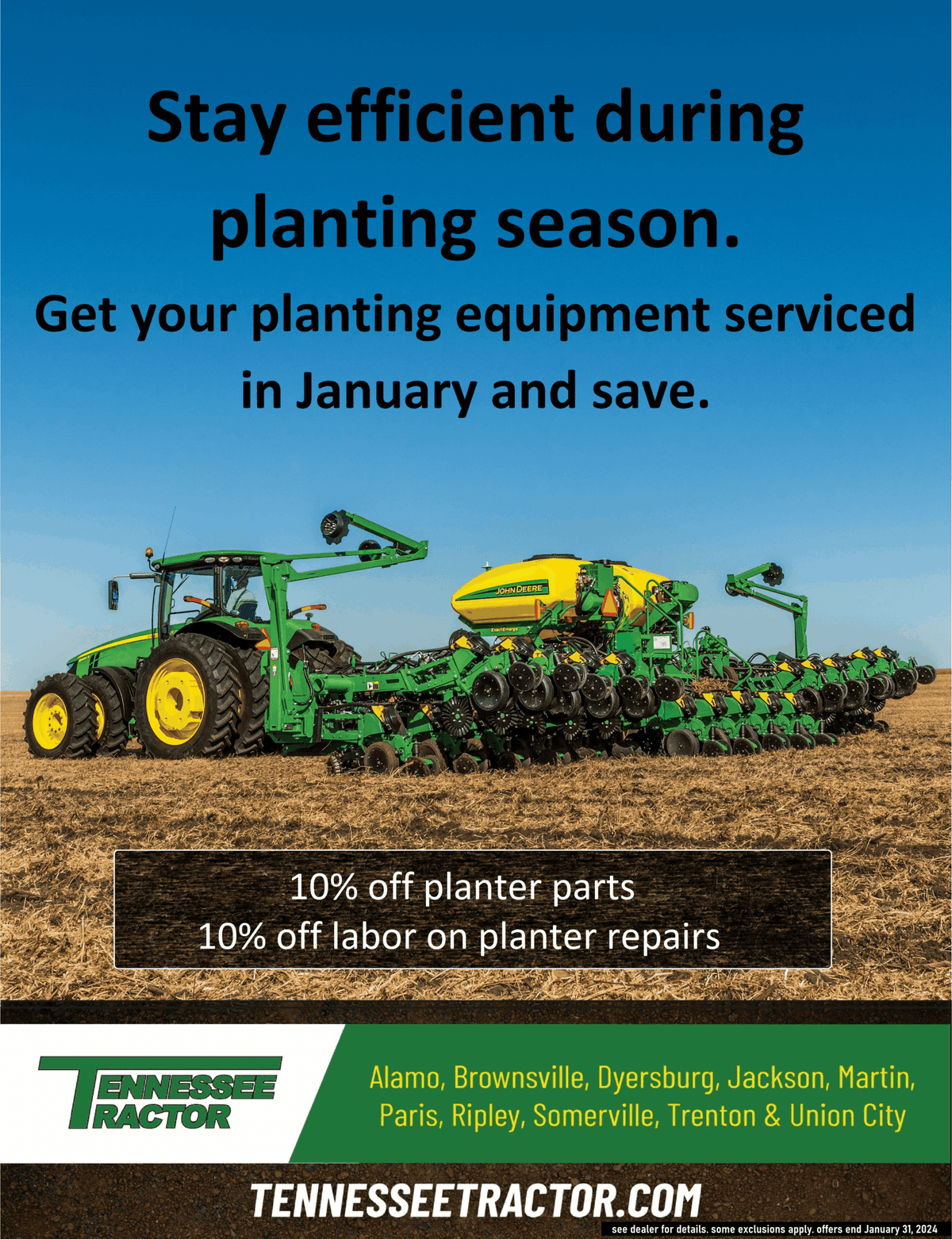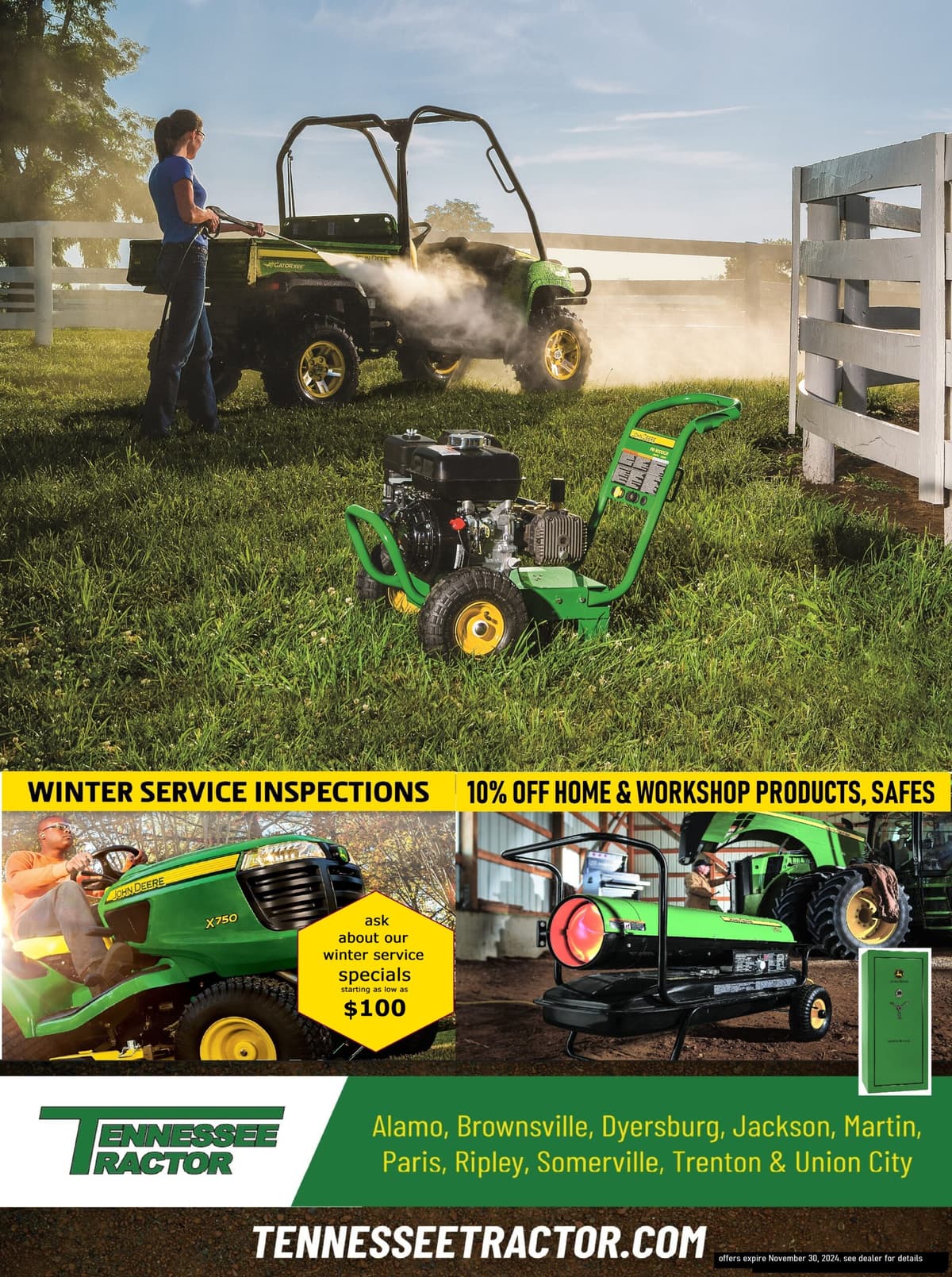 When you’re invested in making sure your tractor, UTV, or stays in great working order for years to come, you need knowledge and skill you can count on. Our highly trained technicians are dedicated to maintaining and servicing your John Deere so you can get the most out of your purchase. Here at we know that when there’s work to be done, you need your machine running smoothly and efficiently. We are here to make sure your keeps getting the job done, season after season.Reliability is critical when you invest in the machinery you need, and we have the equipment and experience to get your tractor, UTV, zero turn mower, and more in prime shape. Give us a call and we'll get you in and out of the shop in an efficient and timely manner, so you can get back to work.Tennessee Tractor is proud to provide quality service to all of West TN and the surrounding areas!