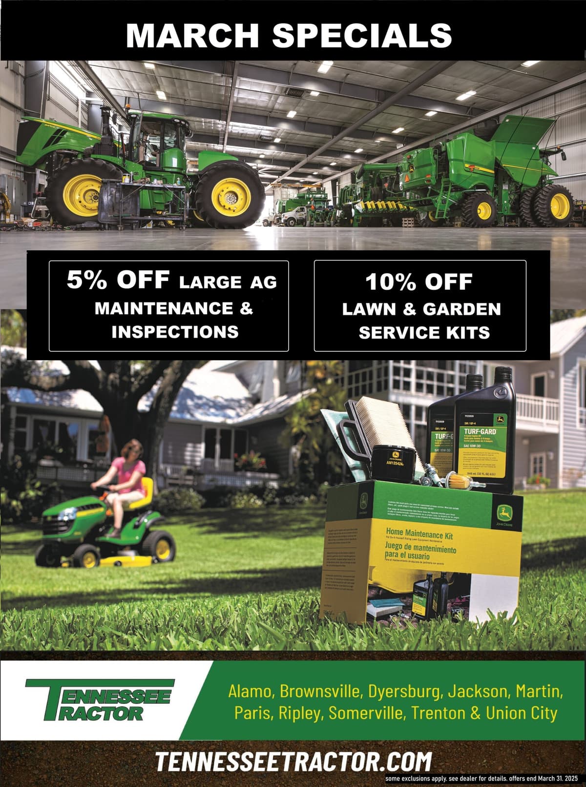 When you’re invested in making sure your tractor, UTV, or stays in great working order for years to come, you need knowledge and skill you can count on. Our highly trained technicians are dedicated to maintaining and servicing your John Deere so you can get the most out of your purchase. Here at we know that when there’s work to be done, you need your machine running smoothly and efficiently. We are here to make sure your keeps getting the job done, season after season.Reliability is critical when you invest in the machinery you need, and we have the equipment and experience to get your tractor, UTV, zero turn mower, and more in prime shape. Give us a call and we'll get you in and out of the shop in an efficient and timely manner, so you can get back to work.Tennessee Tractor is proud to provide quality service to all of West TN and the surrounding areas!